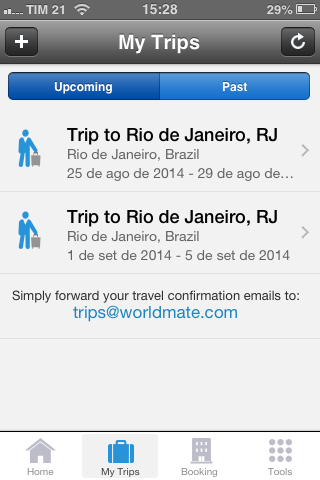 1. Você pode enviar um email para trips@worldmate.com com o resumo da sua viagem, ou com a confirmação.